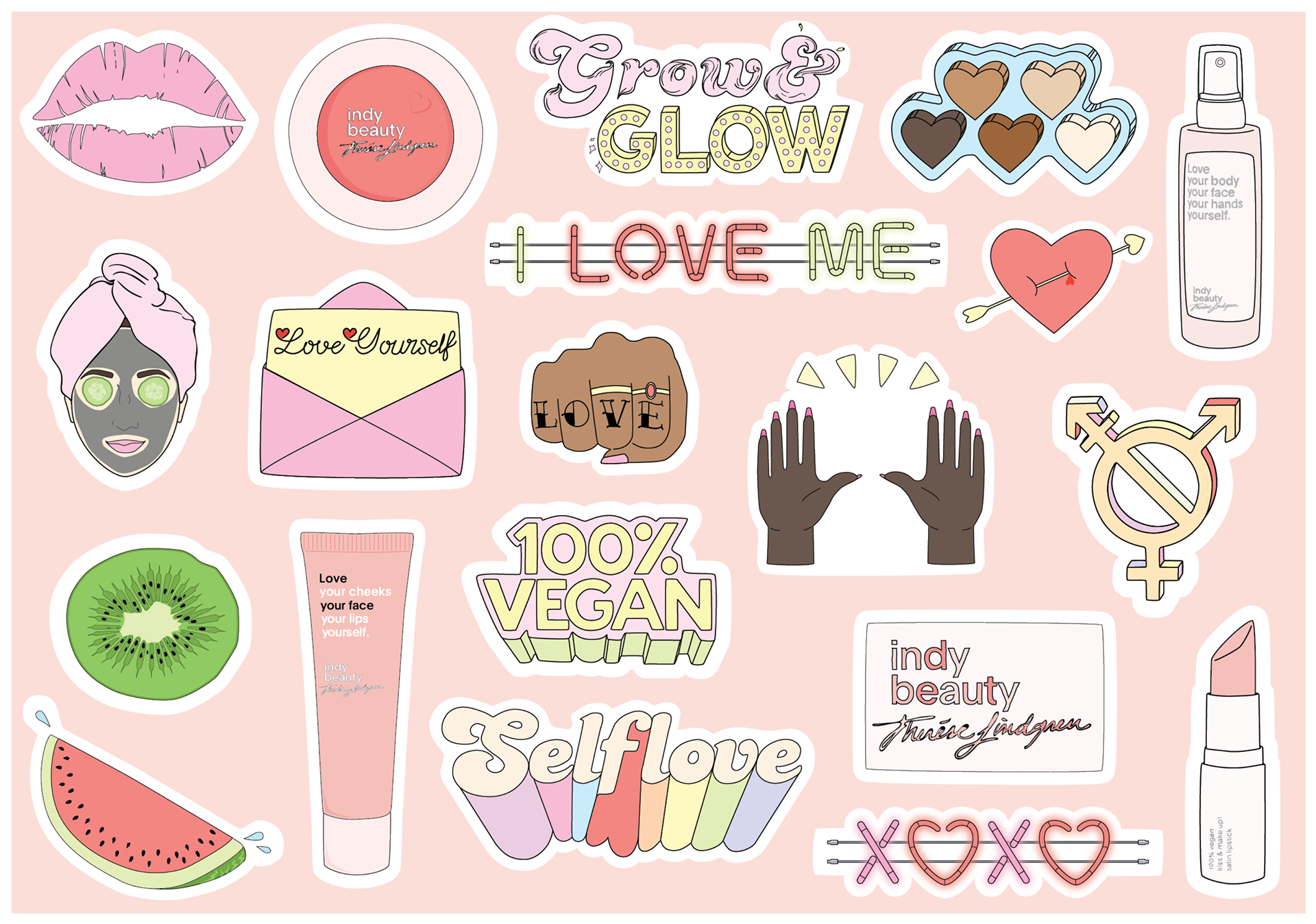 Skapade klistermärken för Indy Beauty med temat självkärlek och skönhet.